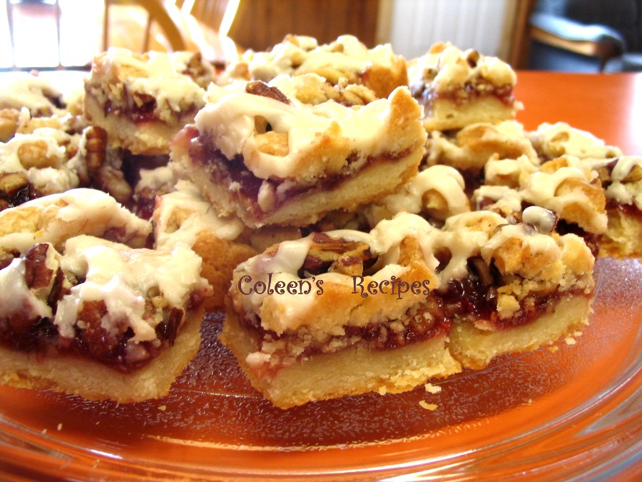 The bottom crust is a deliciously TENDER shortbread, together with then in that place is a unproblematic layer of raspberry jam, nuts together with to a greater extent than shortbread pieces on top. It couldn't live easier!!! The master copy recipe didn't bring a frosting, but I intend every cookie bar needs a drizzle, don't you? (My tweaks to this recipe are inwards blue).
